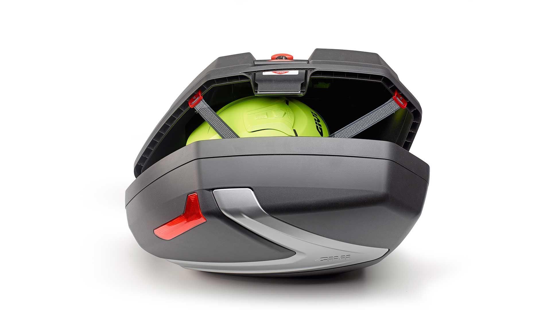 - Ein modularer Helm kann im Inneren verstaut werden (37 Liter Volumen).
