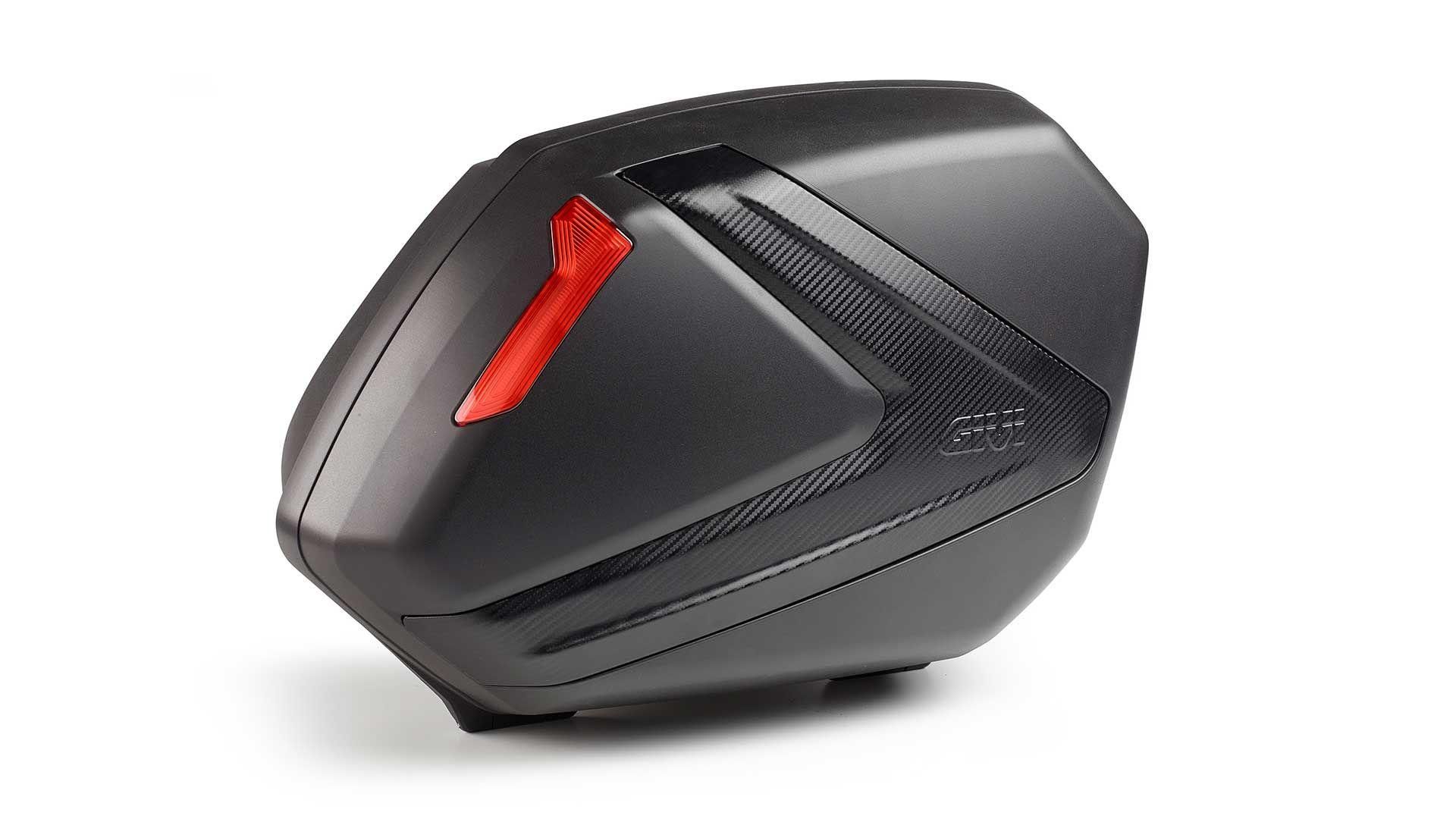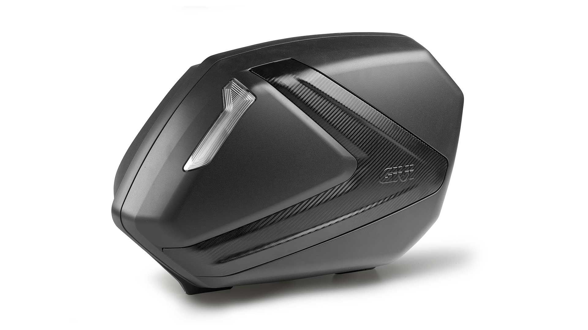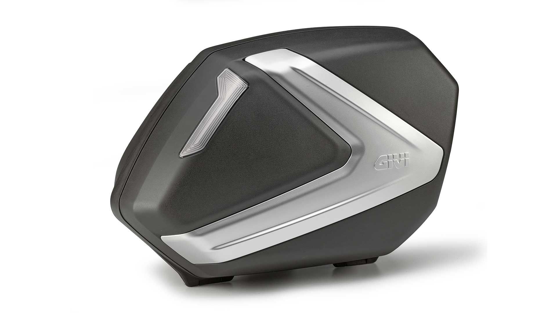 Der Motorrad-Seitenkoffer verfügt über ein innovatives Design und eine unverwechselbare Optik. Der zentrale Bereich zeichnet sich durch einen Einsatz aus, der an einen Pfeil erinnert und in opaken Silber- oder "Carbon" -Ausführungen erhältlich ist. Dieses aerodynamisch ansprechende Element, unterscheidet das Givi-Markenaccessoire von allen anderen im Umlauf!