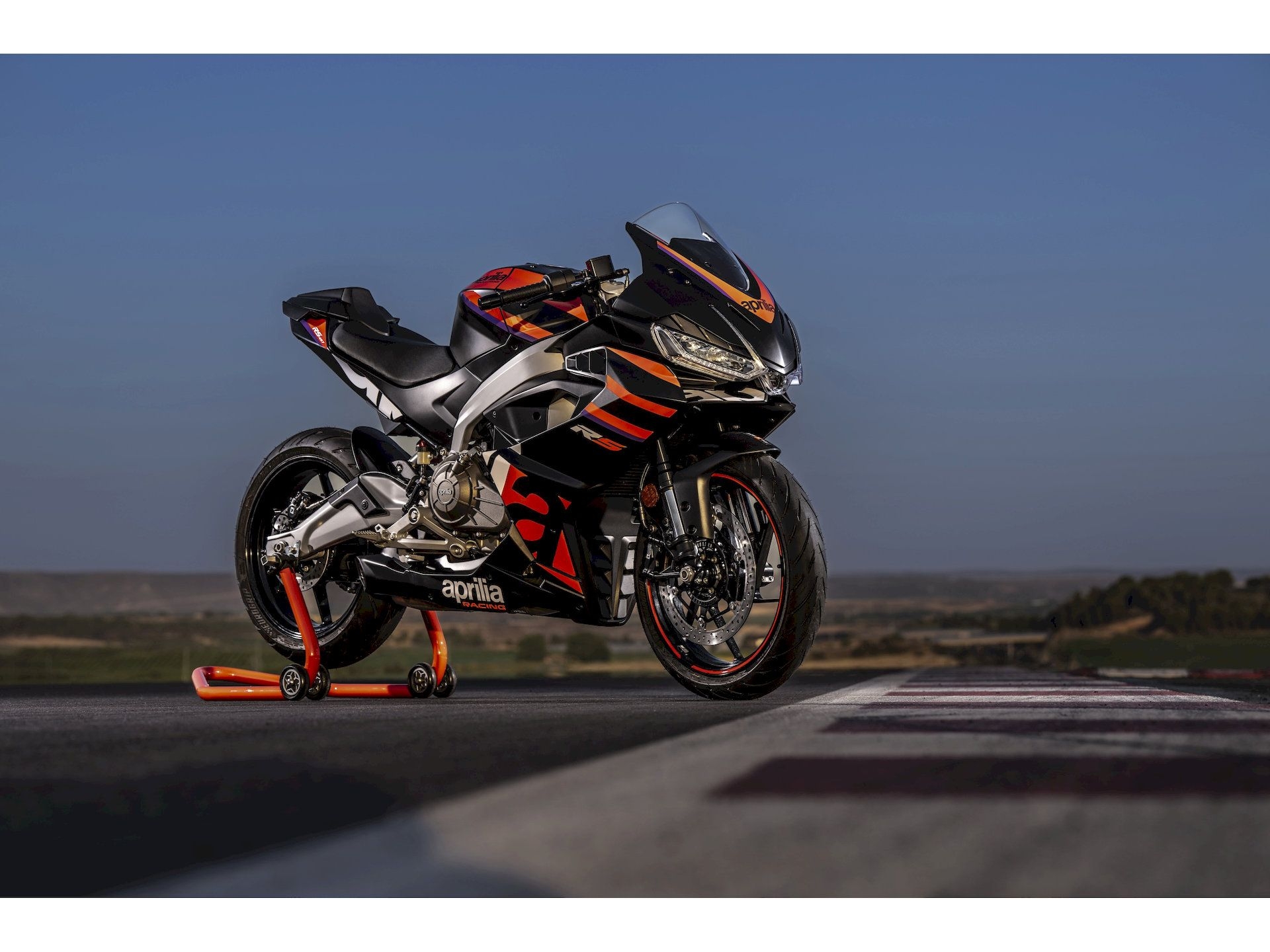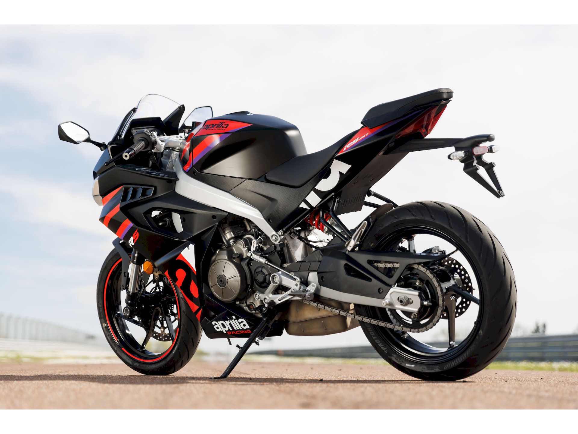 Als einziges Motorrad seiner Klasse vertraut die RS 457 auf einen massiven Aluminium-Zweistrahler-Rahmen. Der Motorblock ist als tragendes Element integriert – eine Lösung direkt aus der Welt der RS 660, die für unerreichte Präzision und radikale Gewichtsreduzierung sorgt.