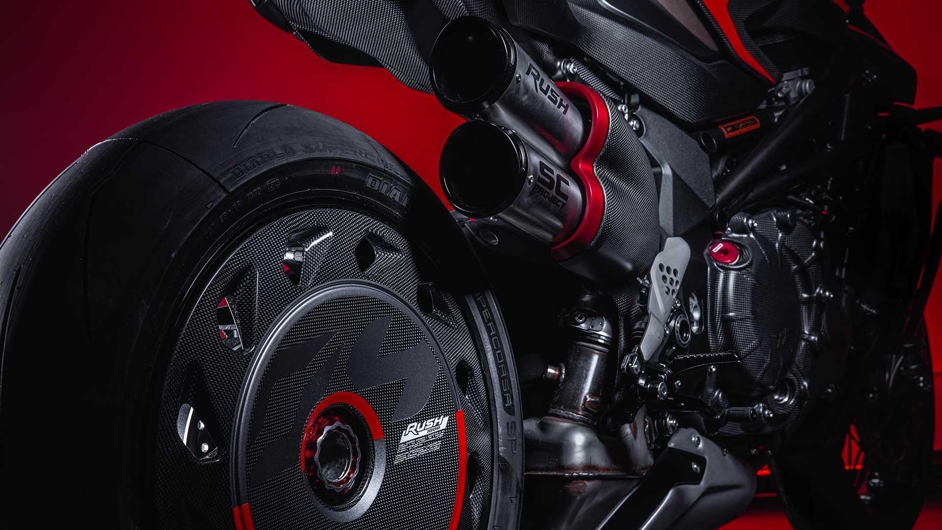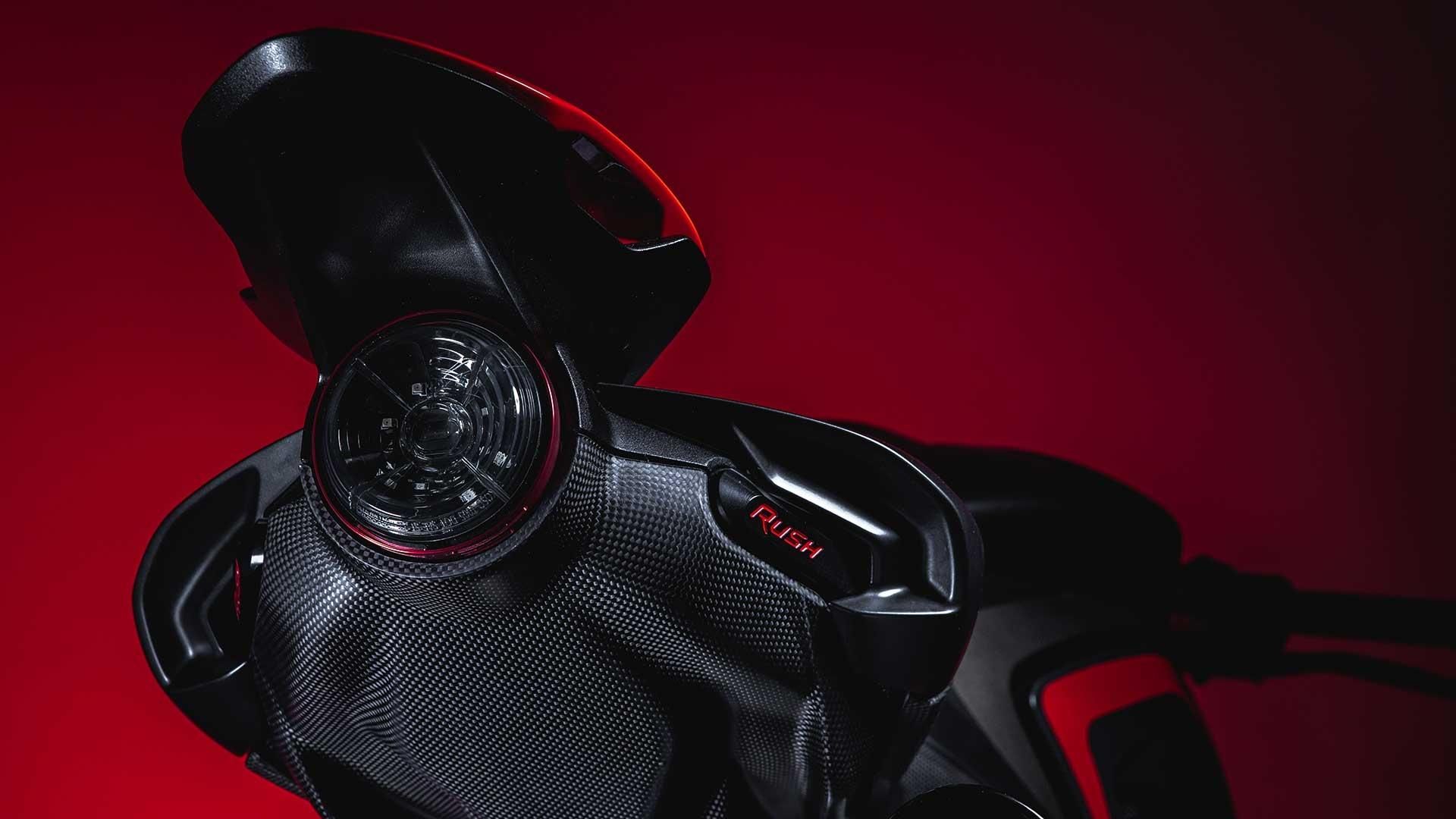 Das optionale Rush Racing Kit besteht aus einem extrem leichten Titan-Doppelauspuffschalldämpfersystem mit einer speziellen Kohlefaserabdeckung mit CNC-gefrästen Billet-Einsätzen sowie einem Motorsteuergerät mit einem speziell entwickelten Motorsteuerungssystem, um die Leistung zu erhöhen und zu optimieren. Ebenfalls enthalten ist ein einzigartiger Sitzbezug aus Kohlefaser.