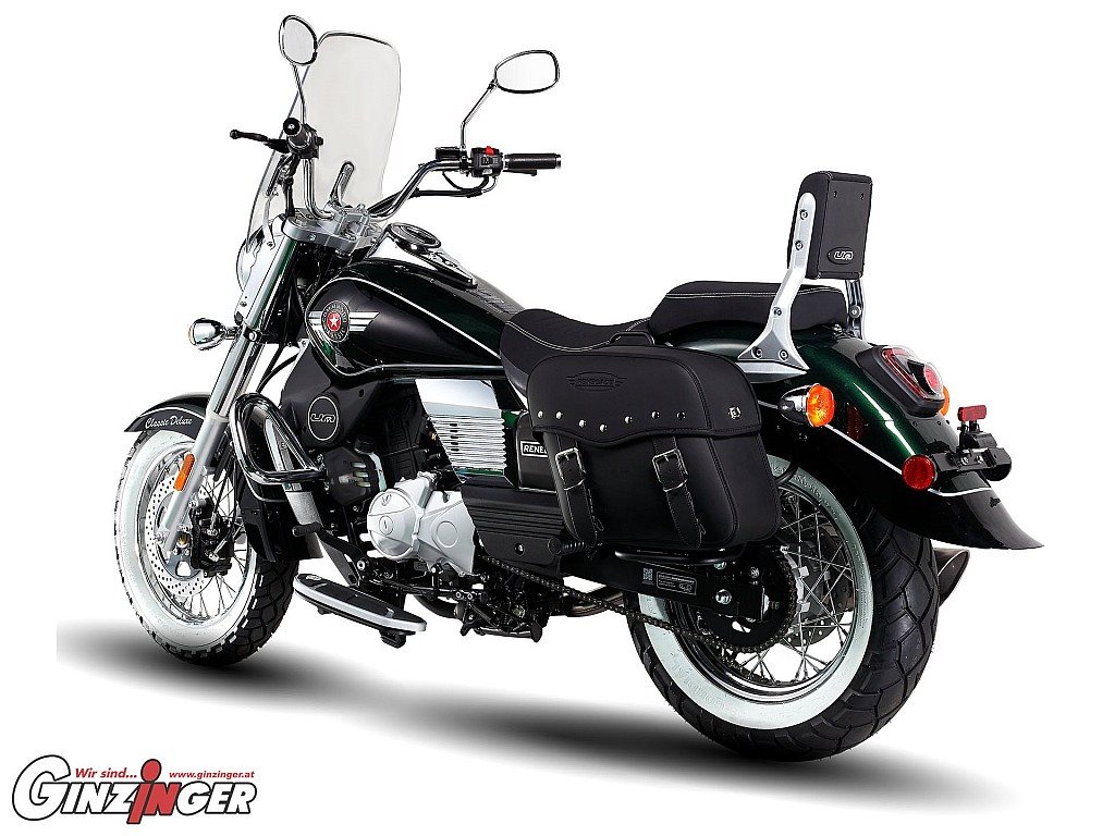 Lässige 125er Chopper im klassischen Stil, mit Seitentaschen und praktischer Rückenlehne für Beifahrer.