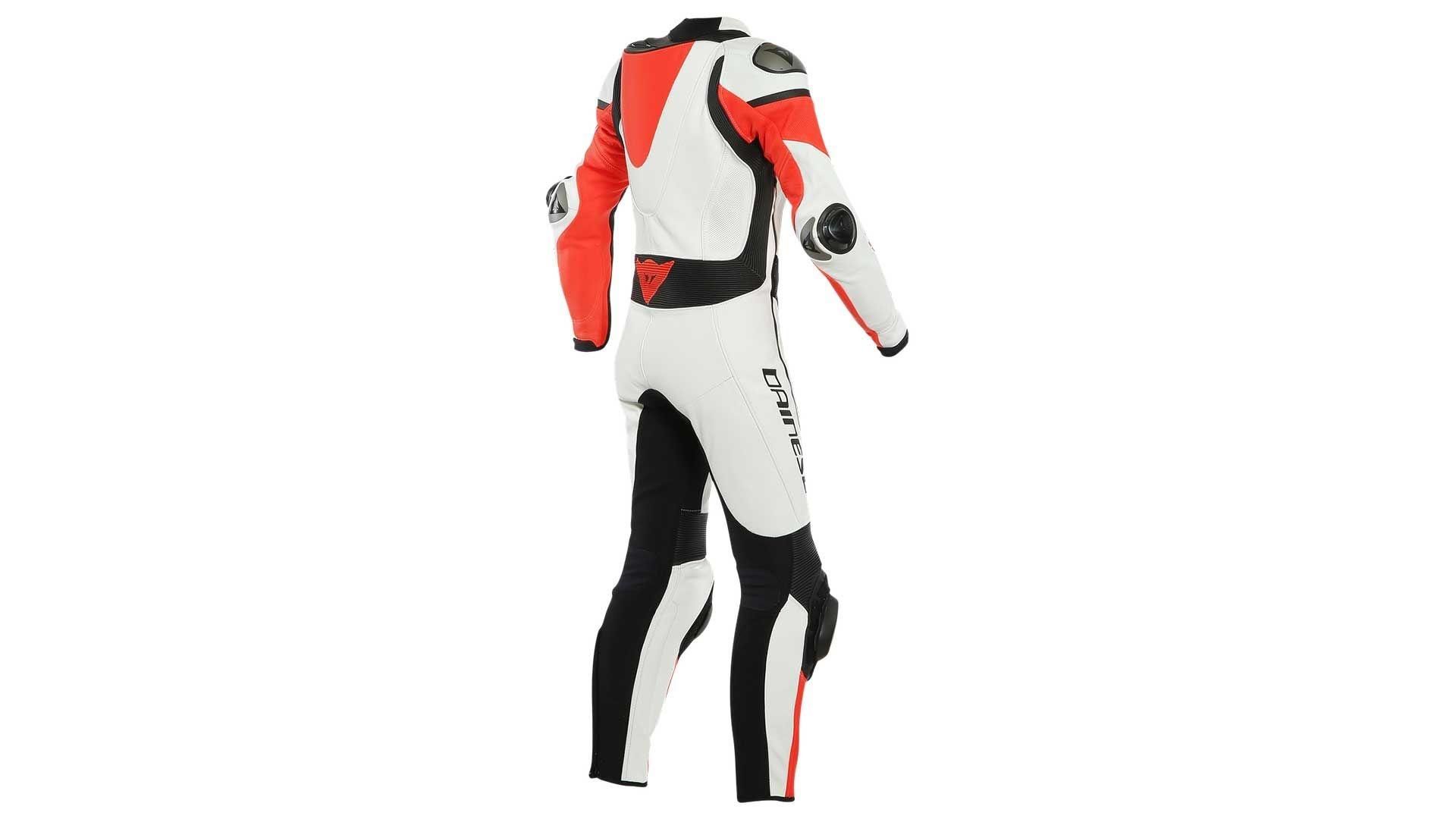 Dainese steht für Sicherheit: Verbundprotektoren an Ellbogen und Knien, weiche Pro-Shape 2.0 Hüftprotektoren und die Konstruktion mit schwimmender Schulter mit Verbundprotektoren und Aluminiumplatten, austauschbar und personalisierbar. Die Metallplatten an den Schultern – ein Markenzeichen und ein exklusives Patent von Dainese – unterstützen das Rutschen bei einem Sturz, sodass gefährliche Überschläge vermieden werden. Ein wesentlicher Unterschied im Vergleich zu Kunststoffmaterialien, die sich durch den Abrieb stärker abnutzen und mehr Grip auf den Asphalt ausüben.