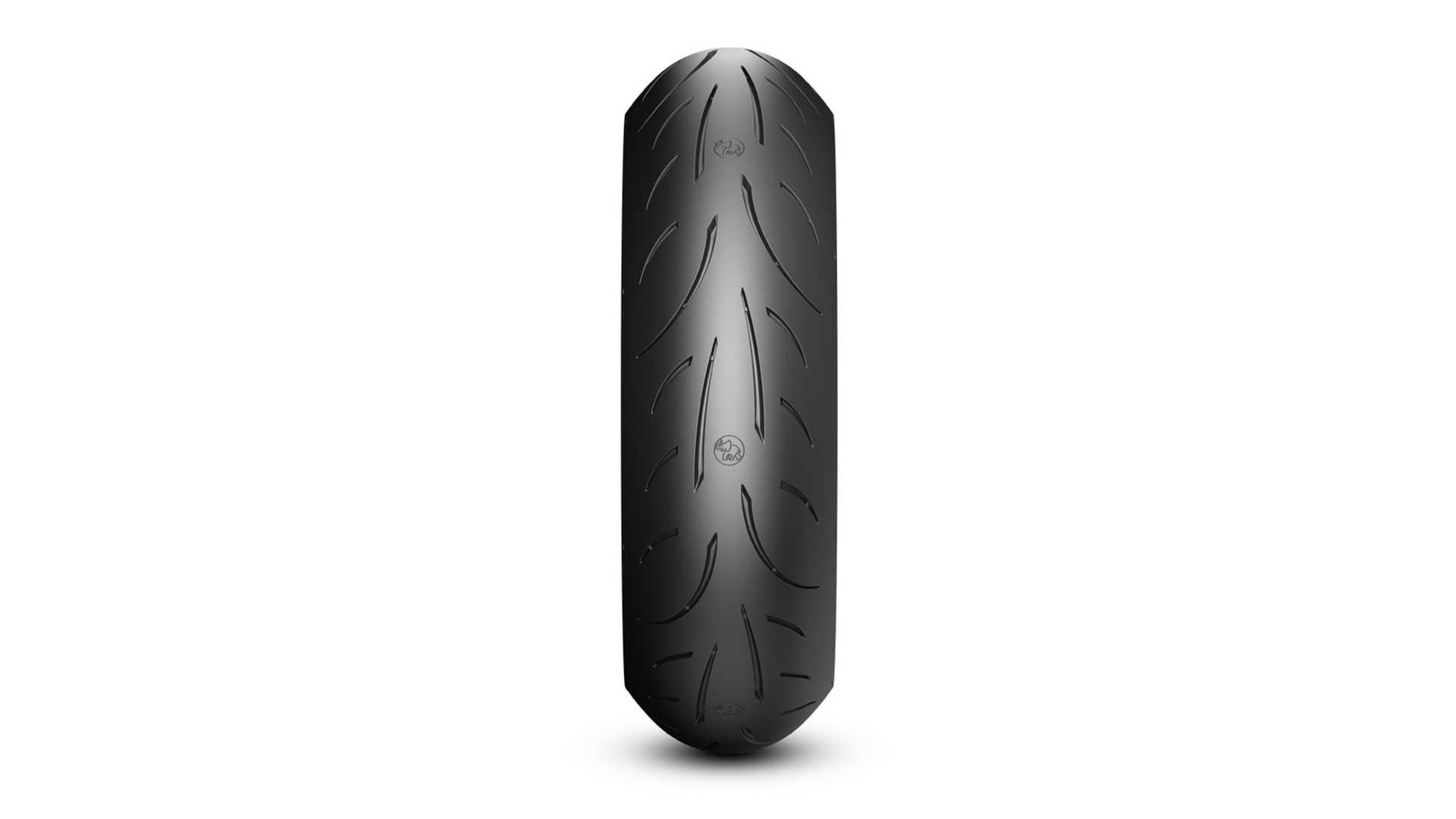 Der M9 RR erbt darüber hinaus die hakenförmigen Profilrillen des noch sportlicheren Schwestermodells Racetec RR. Diese Details im mittigen Bereich des Profils tragen zur Richtungsstabilität auf der Geraden bei und unterstützen wiederum ebenfalls die Performance bei Nässe. Generell ist das Laufflächenprofil für eine Wasserverdrängung bis zu einem Schräglagenwinkel von 30 Grad ausgelegt. Die Schulter des Reifens hingegen kommt mit ihrem sehr geringen Negativ-Anteil einem profilierten Rennreifen nahe. Die logische Folge: Durch den vergrößerten Slick-Berich an den Flanken besitzt er mehr Grip in hoher Schräglage als der Vorgänger. Zumal dort auch die Funktion der Wasserableitung in der Praxis nicht mehr erforderlich ist.