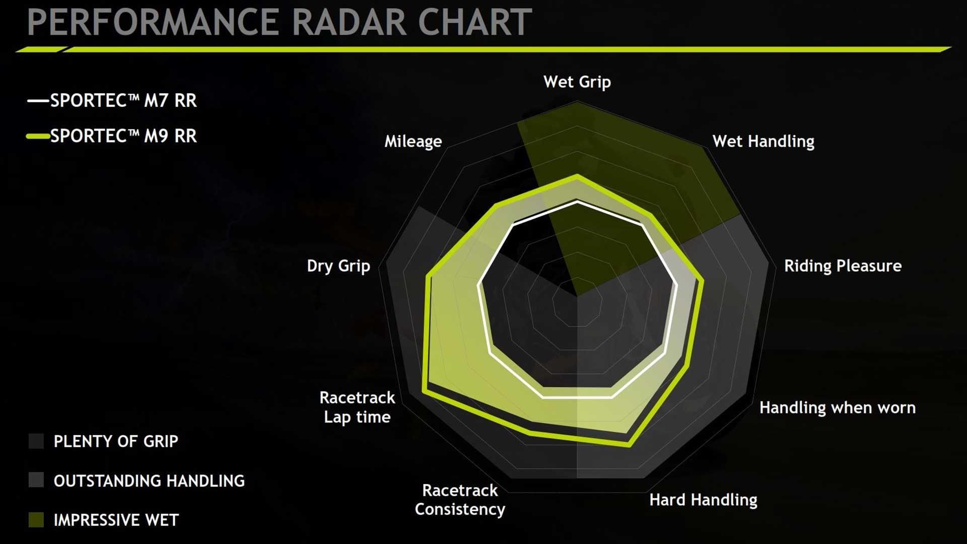Hoher Grip in Schräglage sowie gleichbleibende Performance über die gesamte Reifenfläche - Das Cap&Base zwei Komponenten Mischungs-Layout besteht aus einer weichen Mischung an den Reifenschultern für hervorragenden Grip in Schräglage. Die härtere Mischung in der Reifenmitte gewährleistet Beständigkeit und sorgt für ein gleichmäßiges Aufwärmverhalten über die gesamte Lauffläche. Egal, bei welchen Asphalt- und/oderWetterbedingungen, der SPORTEC™ M9 RR bietet stets besten Grip.